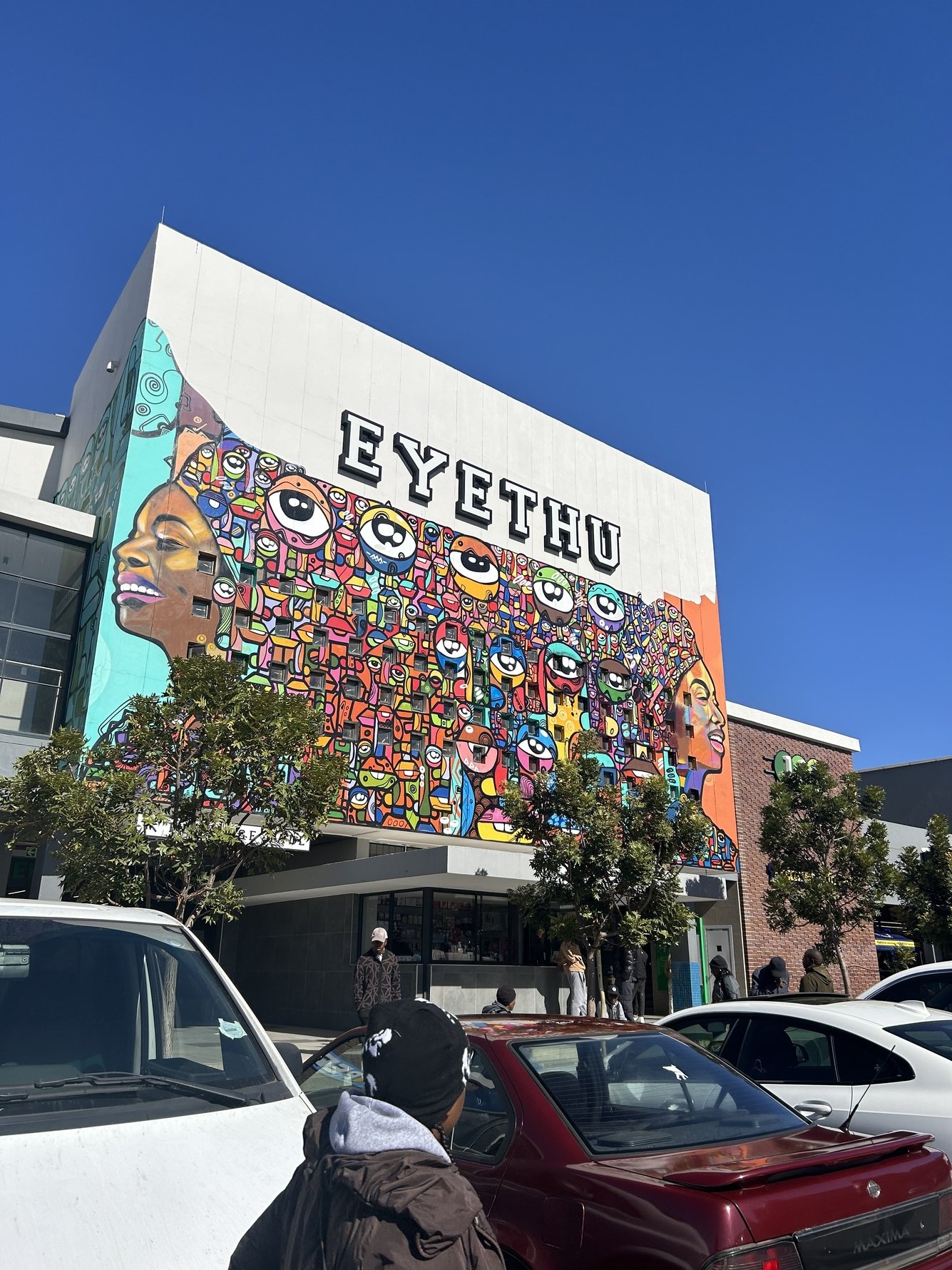 At the Eyethu Heritage Hall, we saw yet more of Nhlapo’s kaleidoscopic murals. They adorn the building’s restored exterior – marking the evolution of this once-abandoned landmark into a vibrant community arts and heritage space. Here, pop art meets museum exhibit to brilliant effect.