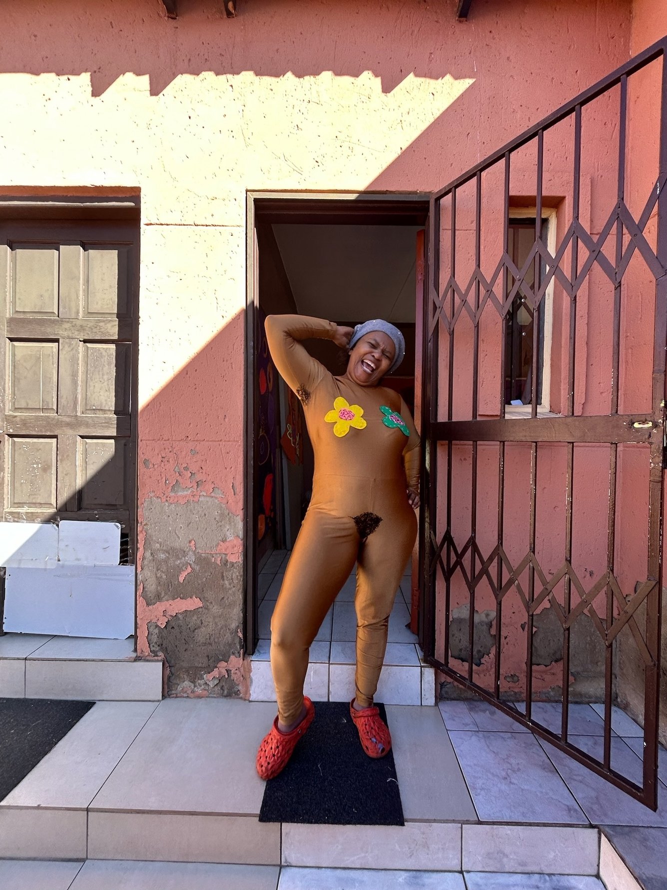 Lest we forget the best part: before she’d uttered more than a few words to the expectant crowd, Motau disappeared for a transformation – returning wearing a one-piece suit she had made herself, with giant floral motifs adorning her chest, the colour of her lycra onesie giving the impression of saucy nakedness. It’s one of those things you have to see to believe, and we were left with the impression that not only is Motau unafraid – she’s a singular figure, and one with a deep sense of humour. It cemented our impression of her as a fascinating practitioner, whose art is not only in the making: it is in the way she lives, too.