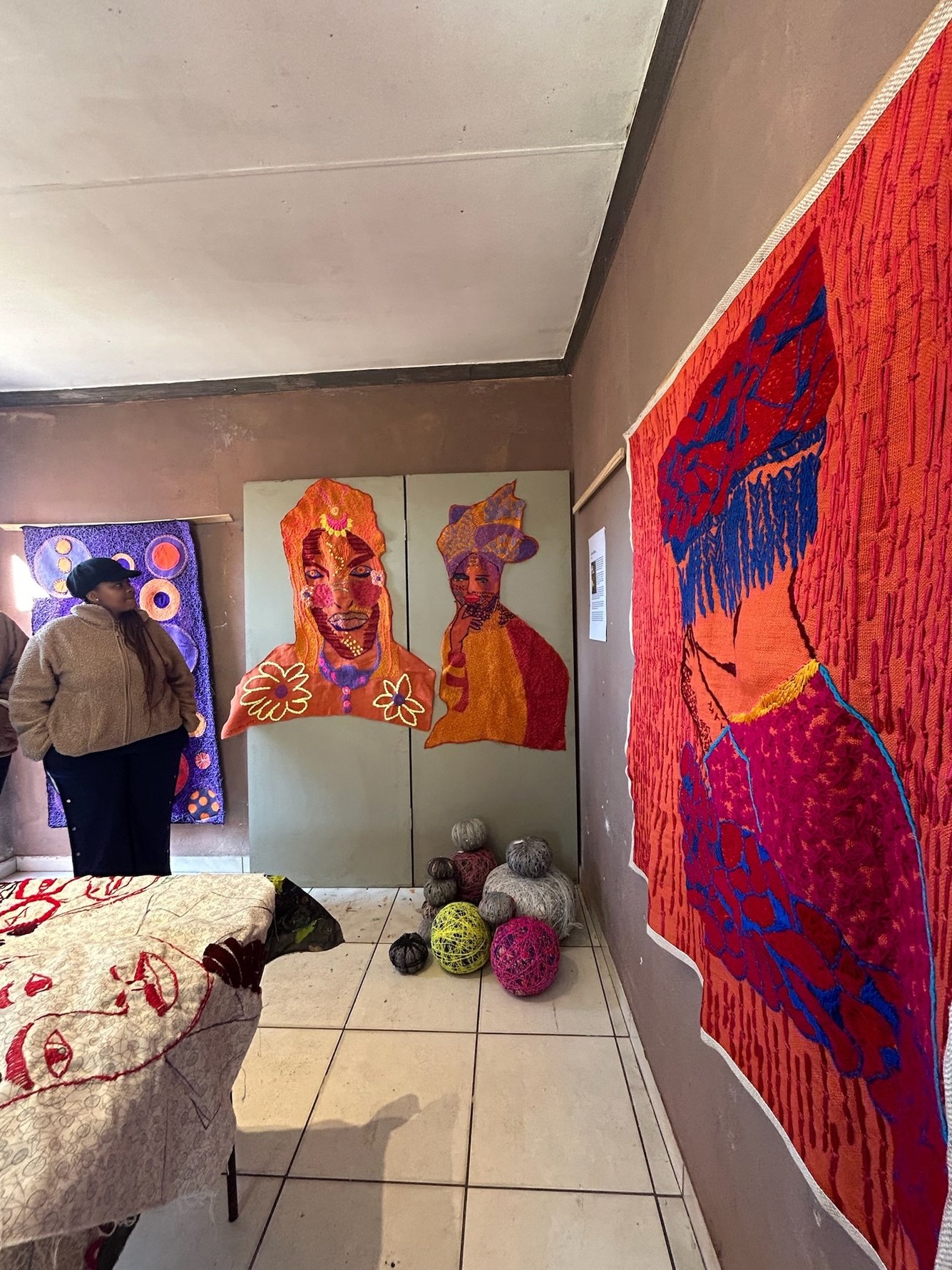 From there, we climbed aboard a bus; our cheerful first stop was the studio of the bubbly Lerato Motau, an artist working in fabric and thread while raising funds for children with dyslexia – a condition she and her daughter also share, making this a matter close to her heart. Her studio is tucked behind her home in the suburb of Mzhimhlope: from the outside, nothing in particular tells you that you are about to enter a space exploding in colour and creativity.