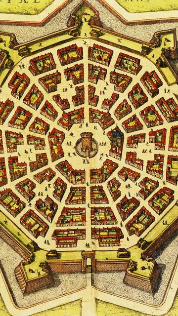 Built by the Venetians at the very end of the 16th century, both to commemorate a large European military victory over the Turks and to serve as a new easternmost defensive garrison against any future incursions, the town consists of several concentric circular ring roads surrounded by a nine-sided defensive wall and moat with outer walls also in the form of a perfect nine-sided star. Roads radiate out towards one of the three gates from the large central square, on which sits a now slightly lopsided glistening white cathedral. In all the town covers an area of some 13.33 square kilometres, and is still home to some 5000 inhabitants.