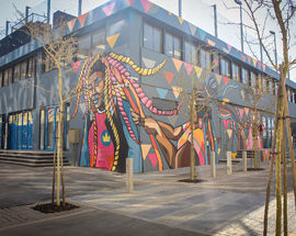 Today what is now known as the Maboneng Precinct has spread out across a dozen adjacent blocks and includes the impressive urban residential and retail development known as Jewel City. Jewel City extends along Fox Street with its pedestrianised plaza and is characterised by large-scale murals by several leading South African graffiti artists, including Nardstar*, Dbongz and Falko One.