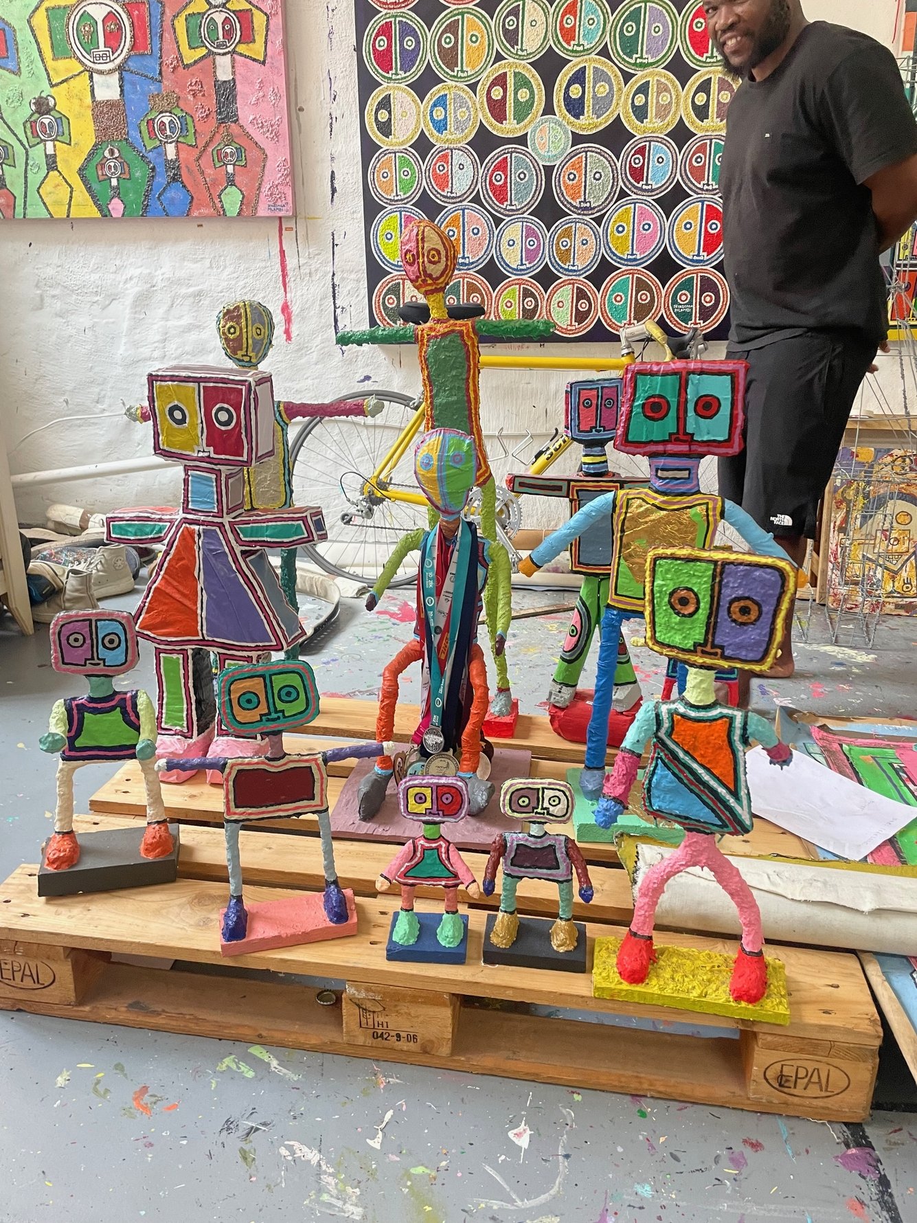 When artists finish works, they set them out in the corridor and landing area on the third floor, where they await critique from their neighbours. Inadvertently, this practice becomes a showcase of the building’s creative diversity – from thickly layered collages and found-object sculptures to large-scale oils and textile works. Artist Siyabonga Mlambi, whose unique style of "khanda art" gives discarded objects a vibrant new life, says being surrounded by such varied practitioners constantly shifts how he approaches his own work.