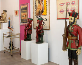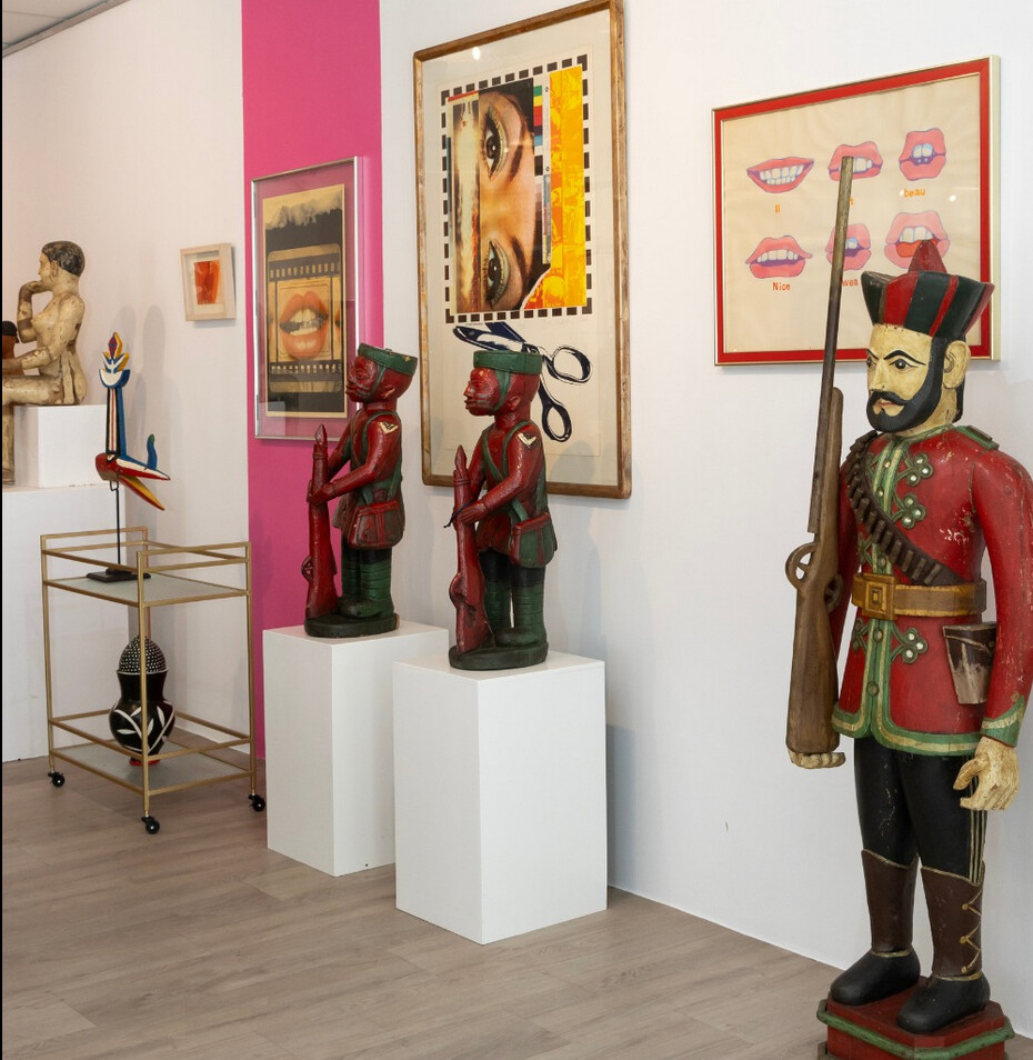 There are more than a few 'colon' figures forming part of the Starcke collection. Head curator and senior art specialist at Strauss & Co, Wilhelm van Rensburg explains how this term originated for a particular form of sculpture which emerged in West Africa under colonialism. These colon figures blend the clothes, accessories, and imagery of colonial settlers with traditional West African carving aesthetics and forms. According to Strauss, they straddle "the encounter between African self-definition and European dominance" and the myriad complexities and resistances that this brought. Indeed, with Starcke pairing them with pop art, political works, and all sorts of other artefacts, these complexities are only deepened.