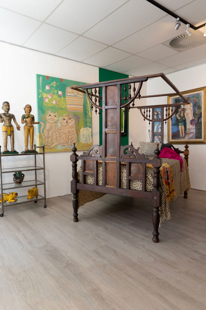 It is unusual for Strauss & Co to auction furniture, and one can see why they would make an exception for this occasion. Antique armchairs from India with animal print upholstery sit next to an Eames chaise lounge, a Giacomo Castiglioni-inspired lamp illuminates lacquered wood panel screens, and a Hans Peter Krafft White lamb children's chair stands next to African masks. A highlight is a canopy bed from Zanzibar, which features decorative panels and leopard-print sheets.