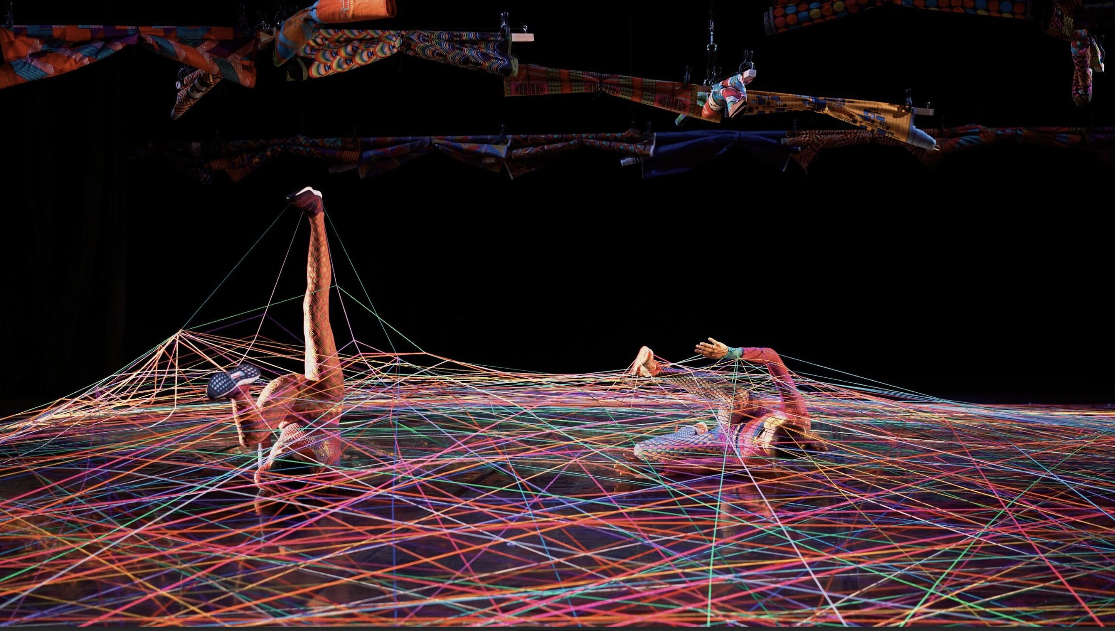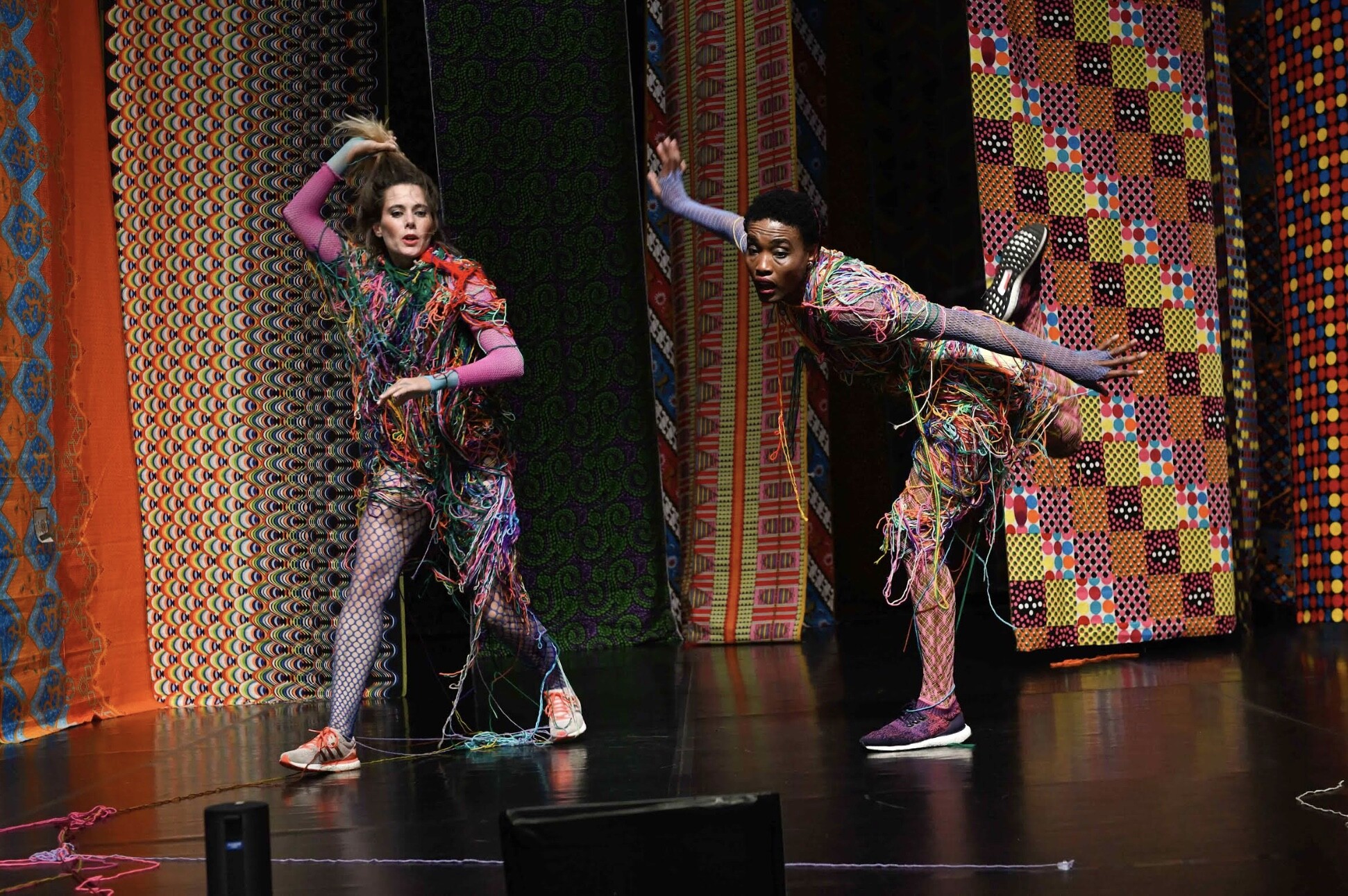 Premiered in 2019 and now a landmark in both artists’ repertoires, Hominal / Xaba tackles cultural appropriation, authorship, identity, and digital-age mimicry with razor-sharp wit, powerful choreography, and visual poetry. Threads, textiles, and looping colour form an ever-shifting landscape on stage as the performers test, tease, and re-weave the frameworks that shape our world.