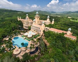 Drive towards the hotel from the Sun City gates and the theatricality begins almost immediately. Monkeys chatter in the trees. Mongoose dart across pathways. Birds call from hibiscus and palms in a carefully engineered “jungle”. When we visited, a jacaranda stood in outrageous bloom, its purple canopy mirrored in the still pools surrounding the monumental hotel.