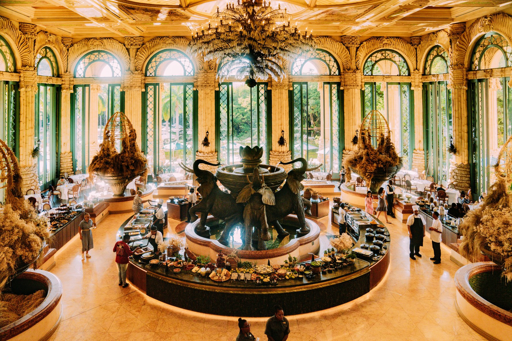 Sunlight floods through towering windows, illuminating carved columns and the operatic theatre of the interiors: animal heads sculpted into the backs of chairs, elephant motifs everywhere, silverware heavy in the hand. Everything is designed to impress, and it does.
