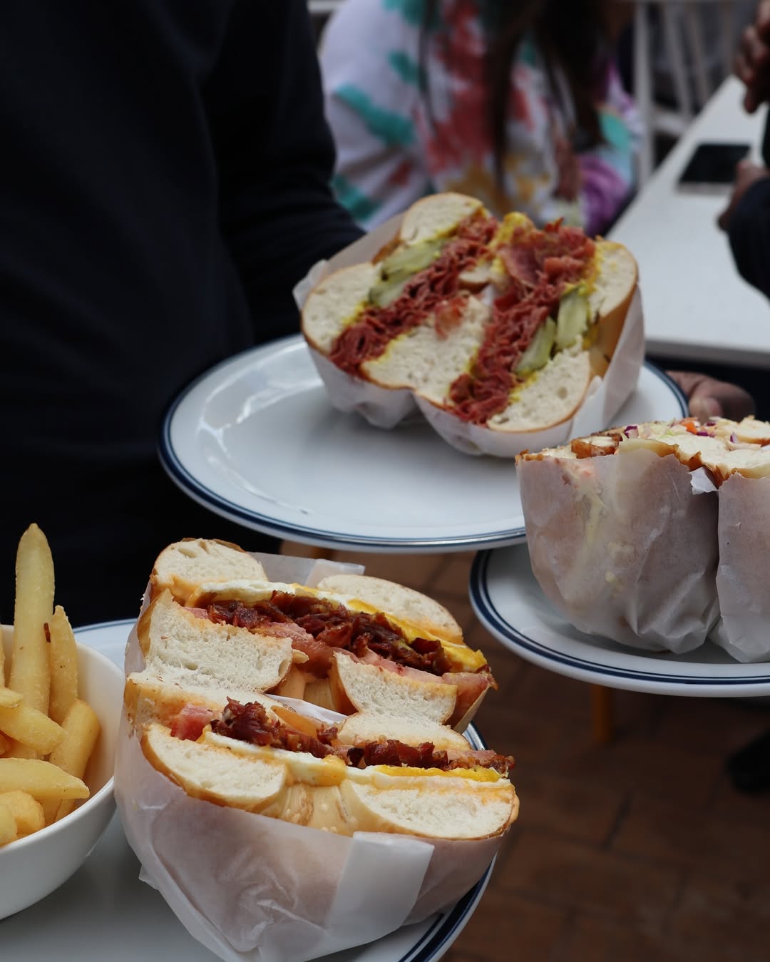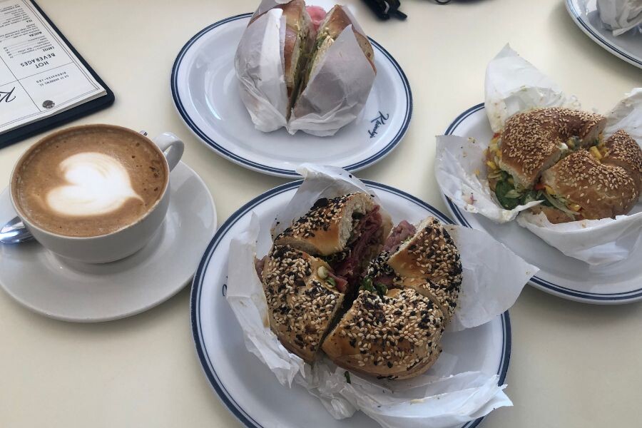 At Kleinsky’s, it all starts before sunrise – bakers arrive around 04:00 or 05:00 to hand-roll, boil, and bake bagels, pastries, and more, all fresh on-site. The menu blends classic bagel staples with playful twists: smoked salmon with cream cheese and capers for the purists; breakfast bagels stacked with cheese, tomato, egg, and bacon or lamb bacon; chicken schnitzel bagels with a hint of Asian flair, topped with slaw and chilli mayo; the signature California bagel starring salmon and avocado; and the teriyaki pastrami bagel, where the sweet-savoury teriyaki pairs perfectly with hearty pastrami.