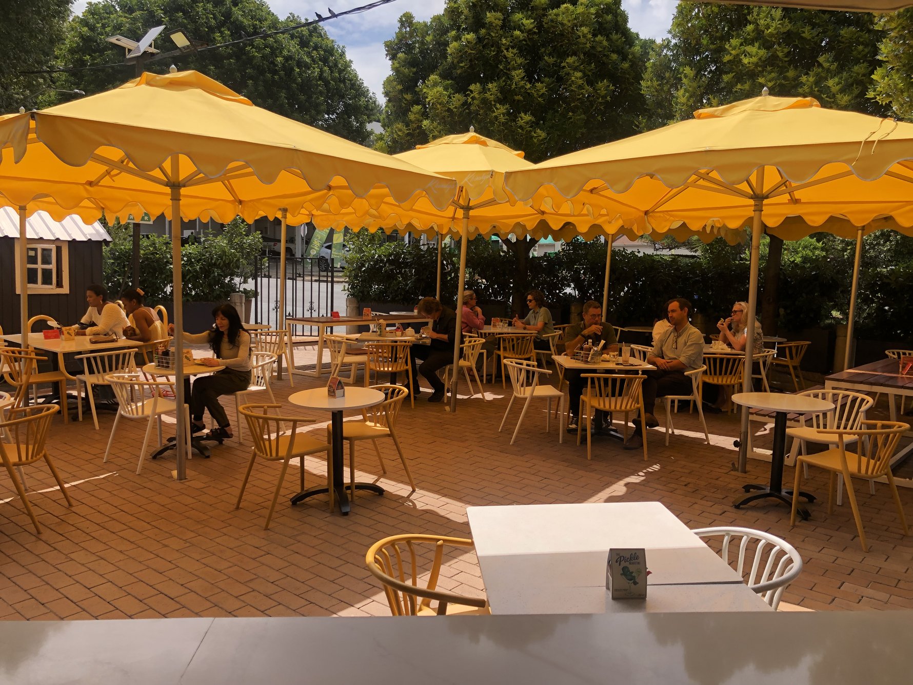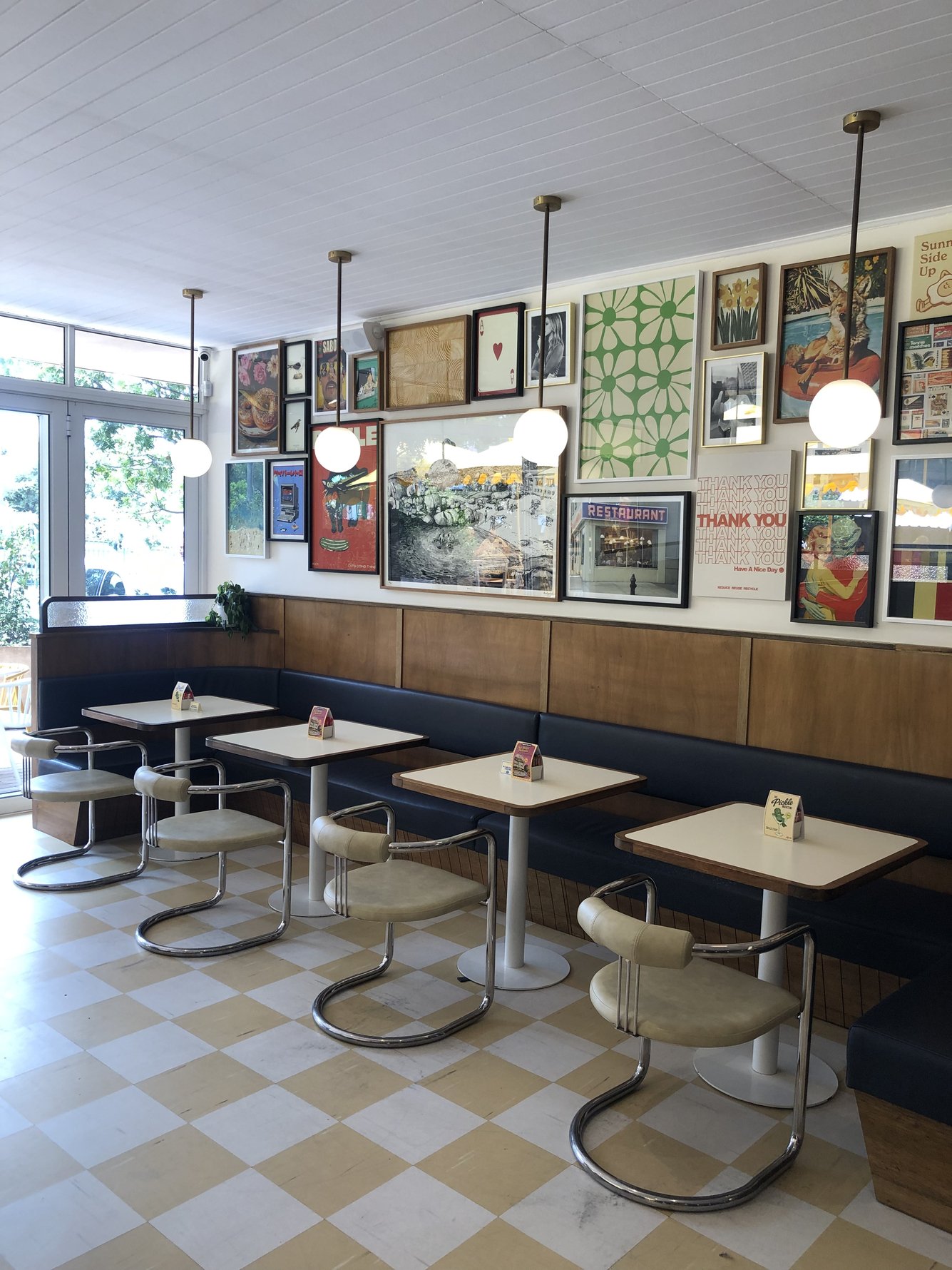 Step inside and the warmth becomes clear. Retro-inspired touches, mod design details, and classic checkered floors offer a refreshing break from the neutral, minimalist look of many Joburg restaurants. Bold, colourful artworks stretch across an entire wall, adding a playful edge while giving the space a warm, lived-in feel. With cosy indoor booths (a rare find these days) and outdoor seating under cheerful yellow umbrellas, it’s a space made for long lunches, quick coffees, and everything in between – designed to be a neighbourhood hangout.