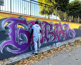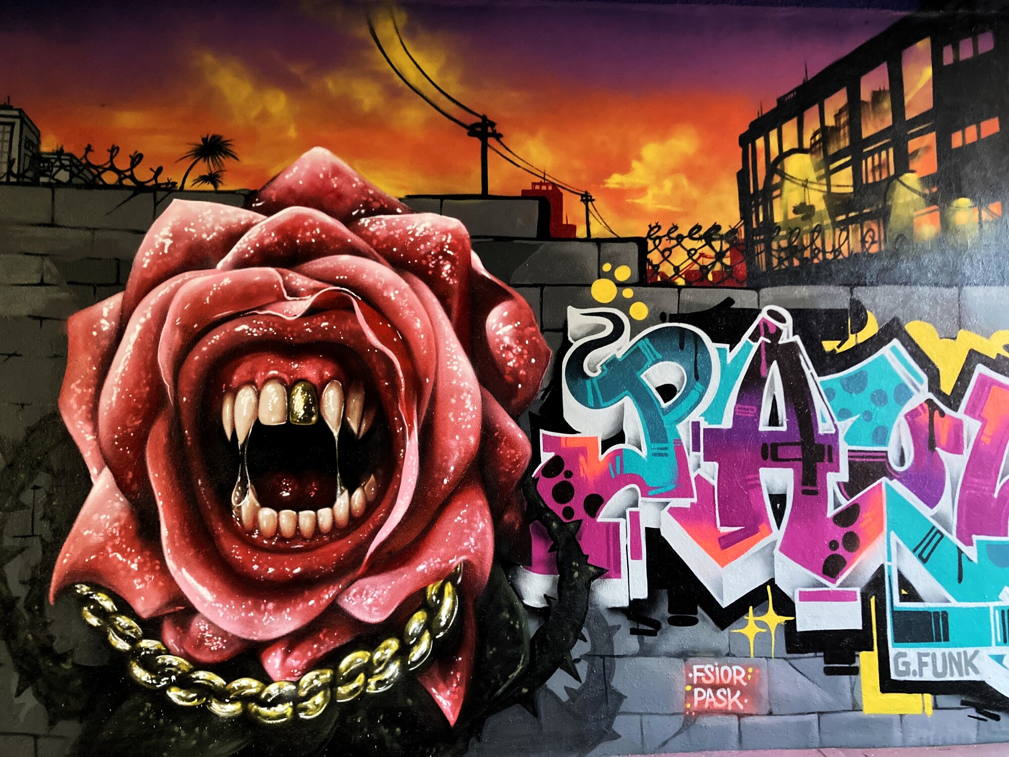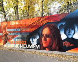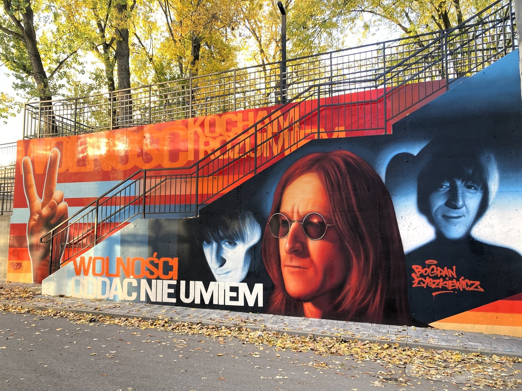 Lastly, the most exciting space for graffiti and street art at NCK is undoubtedly the driveway leading to the back of the building and Przestrzenie Nowohuckie. Both sides of this long corridor are bursting with colourful street art by various artists. Perhaps most notable is a mural by local artist Pieksa commemorating Bogdan Łyszkiewicz - the frontman of the Polish band 'Chłopcy z Placu Broni' - created on the 25th anniversary of his death.