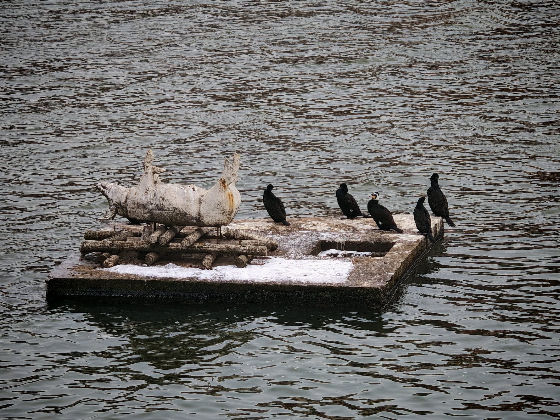 Winter view of Kraków's weird pig sculpture with cormorants. Photo by Dwxn.