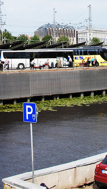 The first thing you’ll notice upon arrival at the bus terminal or autoosta (open 05:00 - 24:00) are the impressive hangars of the Central Market to your right just above the murky waters of the Riga canal. Inside, LuxExpress and Ecolines offices are located to your left as well as ATMs, a left luggage room and lockers (€1 - 2 for the first hour, €0.50 each additional hour) and toilets (€0.30 - ask for paper). You’ll also find a number of shops and a pharmacy (07:00 - 20:00, Sat 07:00 - 19:00, Sun 09:00 - 19:00). A bar/cafeteria, a baby-changing station and even shower facilities are available upstairs. The bus station's information centre is located at window Nr.7 and is open from 09:00 - 21:00 (closed from 12:30 - 13:00 and 17:30 - 18:00). Outside along the canal is a waiting area and an e-talons office (open 09:00 - 19:00, Sat 10:00 - 16:00; closed Sun) where you can buy public transport tickets as well as a ticket machine.