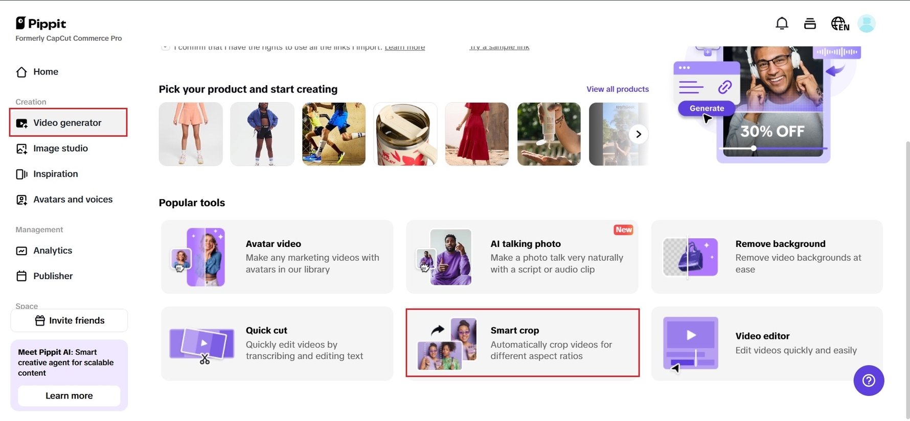Open Pippit and choose the "Smart crop" tool. Import your video directly from your device or cloud storage. The user-friendly interface makes it simple for anyone to start working with resizing videos for social sites like Instagram and TikTok.