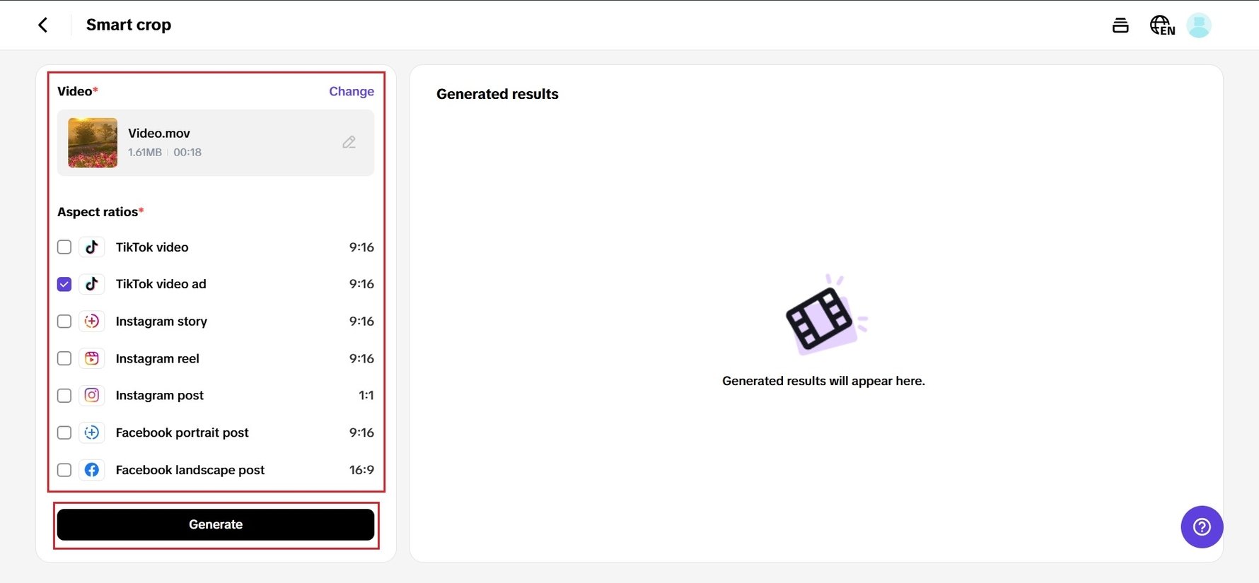 Select your platform's matching aspect ratio, for example, 9:16 for TikTok or 16:9 for YouTube. Make framing adjustments using the live preview and your video will fit perfectly. Pippit optimizes the video for effortless sharing across all platforms.