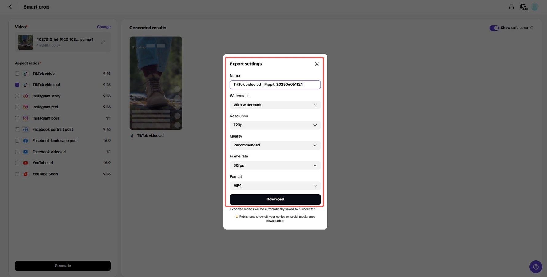 Preview your resized video for quality and correctness. Click export to download the video in your desired resolution. With Pippit, it is possible to resize videos online for free and post your videos straight to Instagram and Facebook, watermark-free.