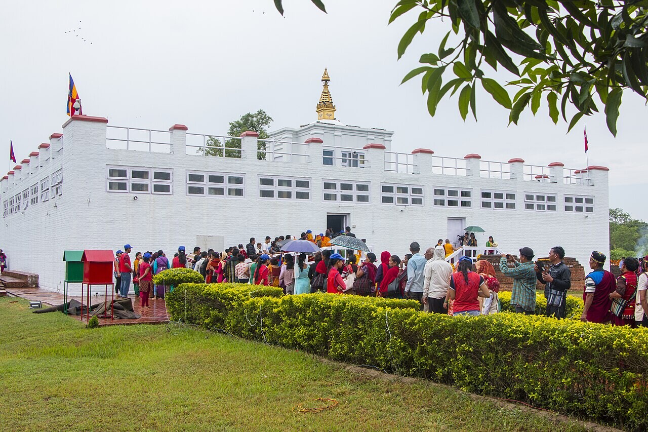 Dress: cover shoulders and knees when entering temples and monasteries; remove footwear at the threshold. This applies throughout the Sacred Garden and the Monastic Zone. Lumbini is an active place of worship for millions of pilgrims.