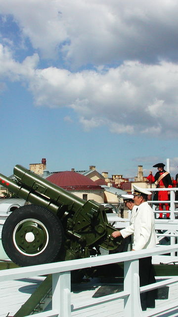 Everyday at 12:00 a shot is fired from a cannon at the Naryshkin Bastion. This custom was introduced under Peter the Great, only in that time it was fired from the Monarch Bastion and signified the beginning or ending of a work shift, or reported the risk of a flood. The tradition of the shot at noon appeared in 1865. In 2000 a new tradition appeared to fire a shot for guests of honour, such as Prince Charles, for example.