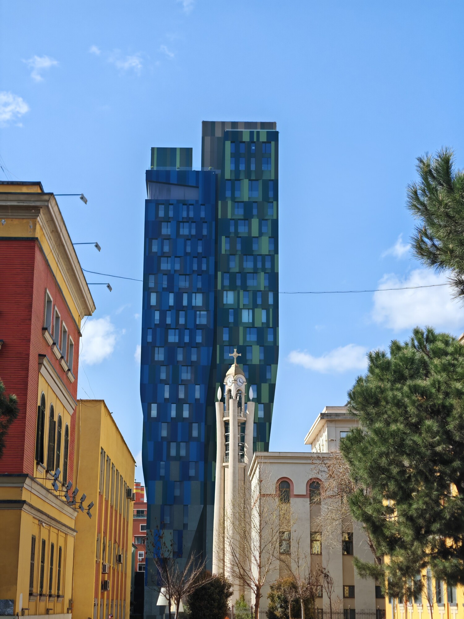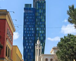 13 Nov 2025Tirana’s Rock (89m, 2025) is featured on the cover of this issue of Tirana In Your Pocket, and overlooks Tirana’s main square. Its balconies form the head of national hero Skanderbeg, and are equipped to allow plants to grow along the facade. The Book Building complex (77m, 2025) with its curious arched balconies rises in a corner of the main square, unfortunately somewhat overshadowing Tirana’s prettiest building, the Et’hem Bey mosque. Next door, the concrete-panelled Maritim Hotel Plaza (85m, 2007) is already one of the older highrises. It changes from an ellipse at ground level to a square at the top, and manages to elegantly include the Ottoman-era Kaplan Pasha tomb in one corner of the building. Across the square, the cantilevered Eyes of Tirana tower (135m, 2025) consists of playfully stacked and slightly wonky cubes. The Alban Tower (107m, 2023) has a tree-shaped design consisting of four green and blue towers, overlooking the Orthodox Cathedral.