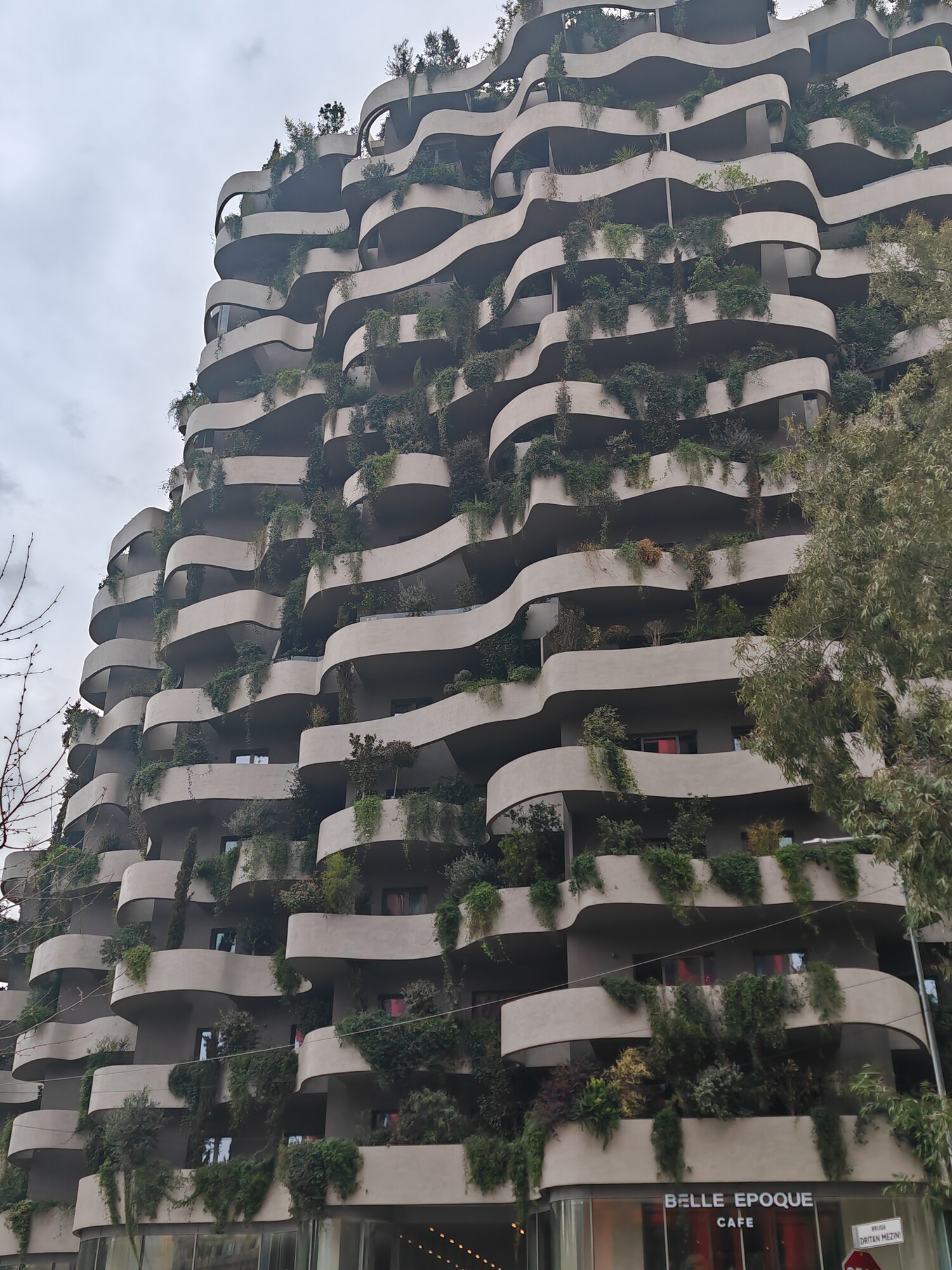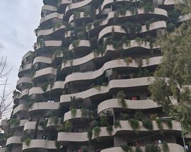 Along the river stands the monolithic bulk of Downtown One (150m, 2025), with pixel-like protruding bay windows that form the map of Albania. Nearby stand the ABA Business Center (83m, 2009) with colourful slats and a regrettable top-floor video screen, and the striking Marriott Hotel tower (112m, 2019) in the Albanian national colours red and black, and attached to the national stadium. Behind the stadium, the quirky Vertical Forest building (75m, 2024) is inspired by Milan’s Bosco Verticale and is planted with 145 trees and 3,000 shrubs.