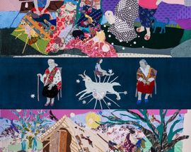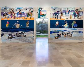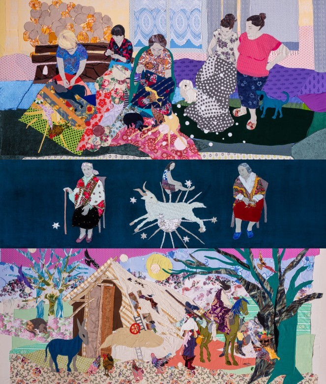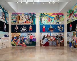 Małgorzata Mirga-Tas's groundbreaking exhibition, Przeczarowując świat (ENG: Re-enchanting the world) is a powerful and inspiring artistic manifesto that challenges stereotypes and broadens the history of art by presenting Roma culture, the largest minority in Europe, through a contemporary lens. Displayed at the Venice Biennale, then in Ferrara, and now in Warsaw, the exhibition is the first time a Roma artist has ever been represented in the more than 120-year history of the event. The installation is an impressive display of twelve large-format fabrics, corresponding to the twelve months of the calendar, that draws inspiration from astrological frescoes found in the Palazzo Schifanoia in Ferrara. The exhibit showcases Małgorzata Mirgi-Tas's re-appropriation of key motifs in European art history by incorporating them into depictions of Polish-Roma culture and reversing the stereotypical narrative. The upper band presents the history of Roma migrations around Europe, challenging anti-Roma stereotypes, while the middle lane is an archive of Roma history built from a female perspective, with symbols borrowed from tarot cards and zodiac signs. Finally, the bottom strip of the composition presents twelve paintings that show contemporary everyday life in the artist's home village, Czarna Góra, and the areas with which she is most associated. The exhibition proposes a new narrative about the constant cultural migration of images and mutual influences between Roma, Polish, and European culture, proposing an enchantment, a non-violent process intended to remove the evil spell from the world and help regain a sense of community and rebuild relationships with others.