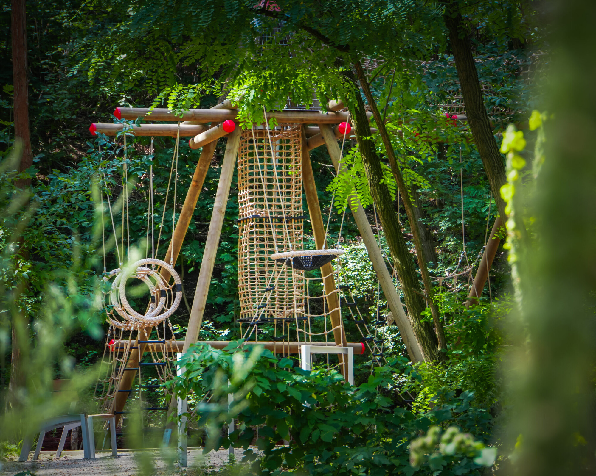Among new amenties here find a nature trail, a footbridge among the trees, and a recreation area for children in a vast meadow. Fans of climbing and zip lining, swings and slides, will all find something here!